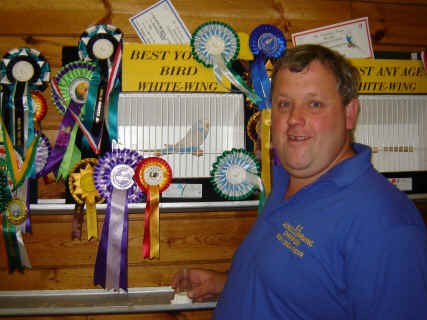 Our Australian guest judge Warren Wilson (President of the Australian Clearwing BS) judged both the Yellow-wings and Whitewings and picked the top award from the Whitewings. There were 46 Yellow-wings and 44 Whitewings entered which was a drop in entry in both colours. The adult yellow-wing award and best yellow-wing in show went to Dave Guppy & Dave Barnes dark green cock; a strong bird of quality but heavy on the marking. Malcolm & Pam Freemantle were second with a light green hen of strong features. Ben Dufosee was third with a dark green hen of good style. Malcolm & Pam Freemantle occupied the first two places in the young bird section with a big and bold dark green hen of good blow, followed by another solid dark green cock. Ben Dufosee was third with a nice quality olive green hen. |